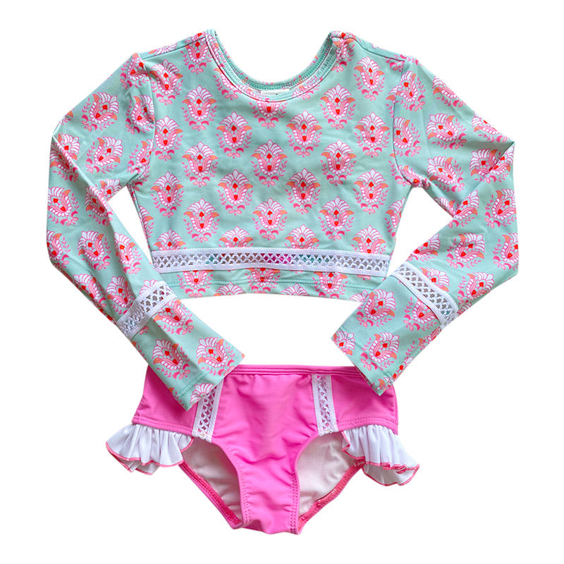 We just love this long sleeve two piece bikini. A cute crop top with key hole back for easy in and out and tie closure. Lots of details and ruffles at the hips will make this a favorite of every little one. Who doesn't love a kini with sun protection?! SPF 50+