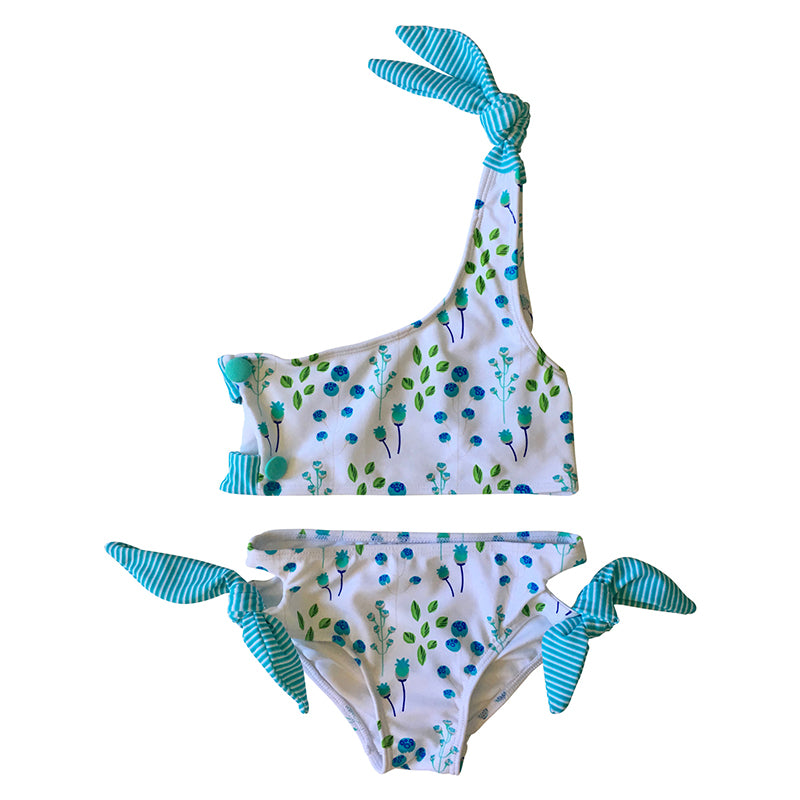 This one shoulder two-piece bikini is a show stopper.  The Parker suit has so many fun details.  Adjustable top and fun open detailing on the sides with sweet button accents.  Fuller coverage bottoms with a tie at the hips.  Sure to be your little ones favorite suit.